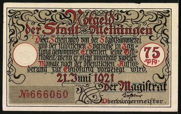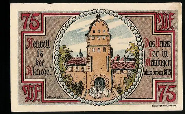 Notgeld Meiningen, 1921, 75 Pfennig, Das Innere Tor in Meiningen auf der Vorderseite und Text