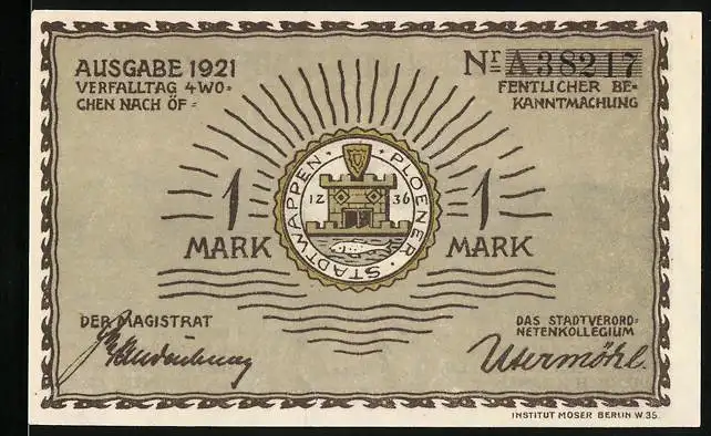 Notgeld Plön 1921, 1 Mark, Stadtwappen und Stadtansicht mit Segelboot und Burg