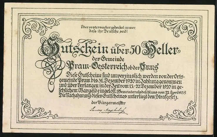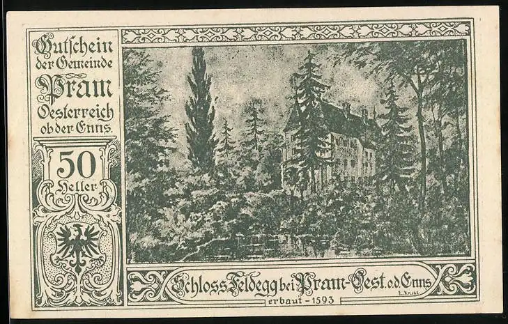 Notgeld Pram 1920, 50 Heller, Schloss Feldegg, Wappen, Landschaftsansicht, Text mit Gültigkeitshinweis
