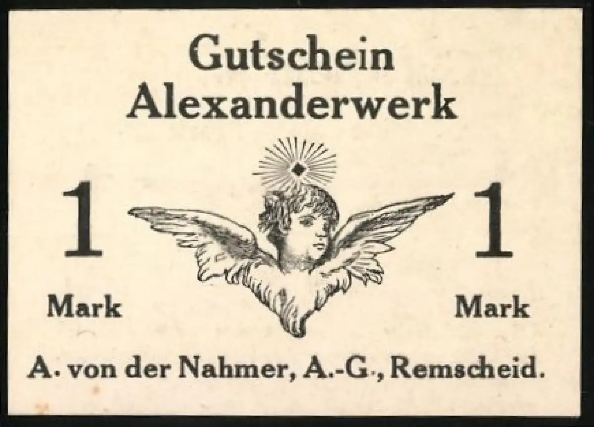 Notgeld Remscheid, 1 Mark, geflügelter Engelkopf, Alexanderwerk-Gutschein A. von der Nahmer AG, KN 2555