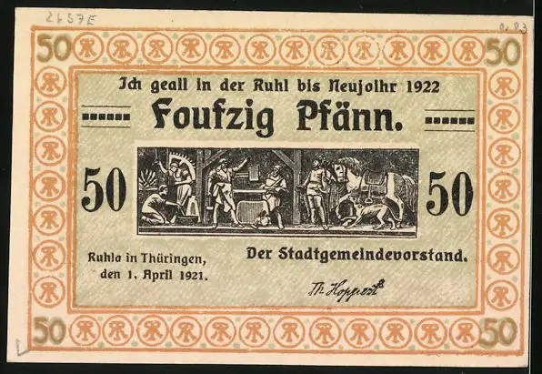 Notgeld Ruhla 1921, 50 Pfennig, Strassenpartie mit Rindern