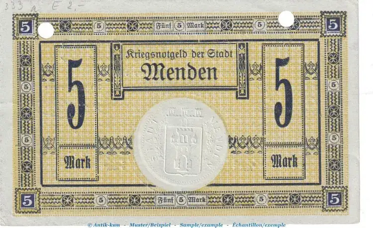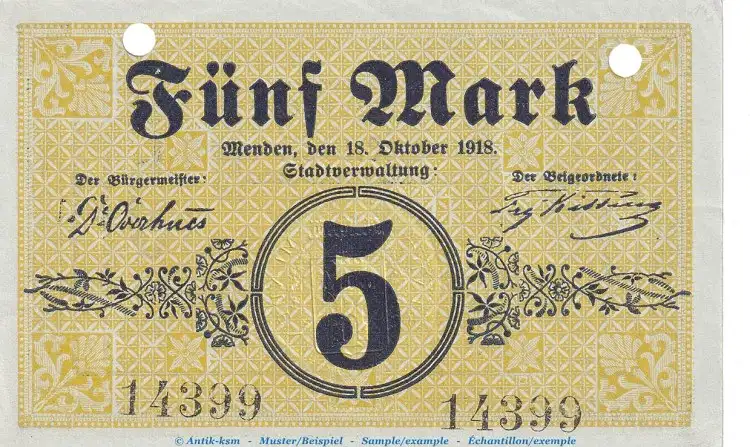 Notgeld Stadt Menden , 5 Mark Schein in kfr.E , Geiger 359.01.a von 1918 , Westfalen Grossnotgeld