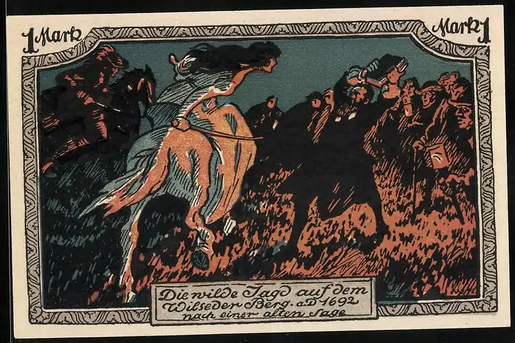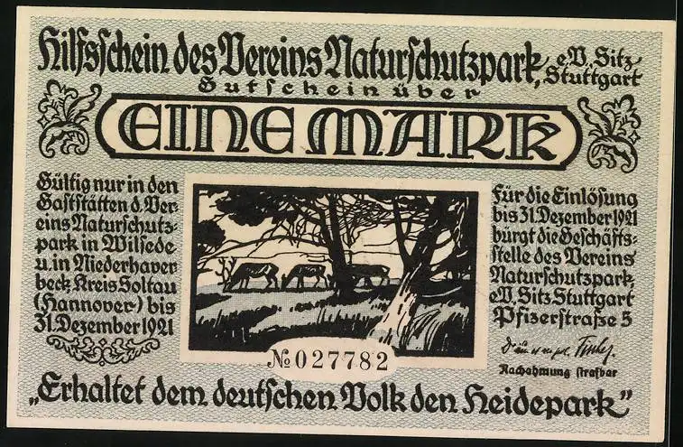 Notgeld Stuttgart 1921, 1 Mark, Wilde Jagd auf dem Wilseder Berg 1692 / Landschaft mit Hirschen