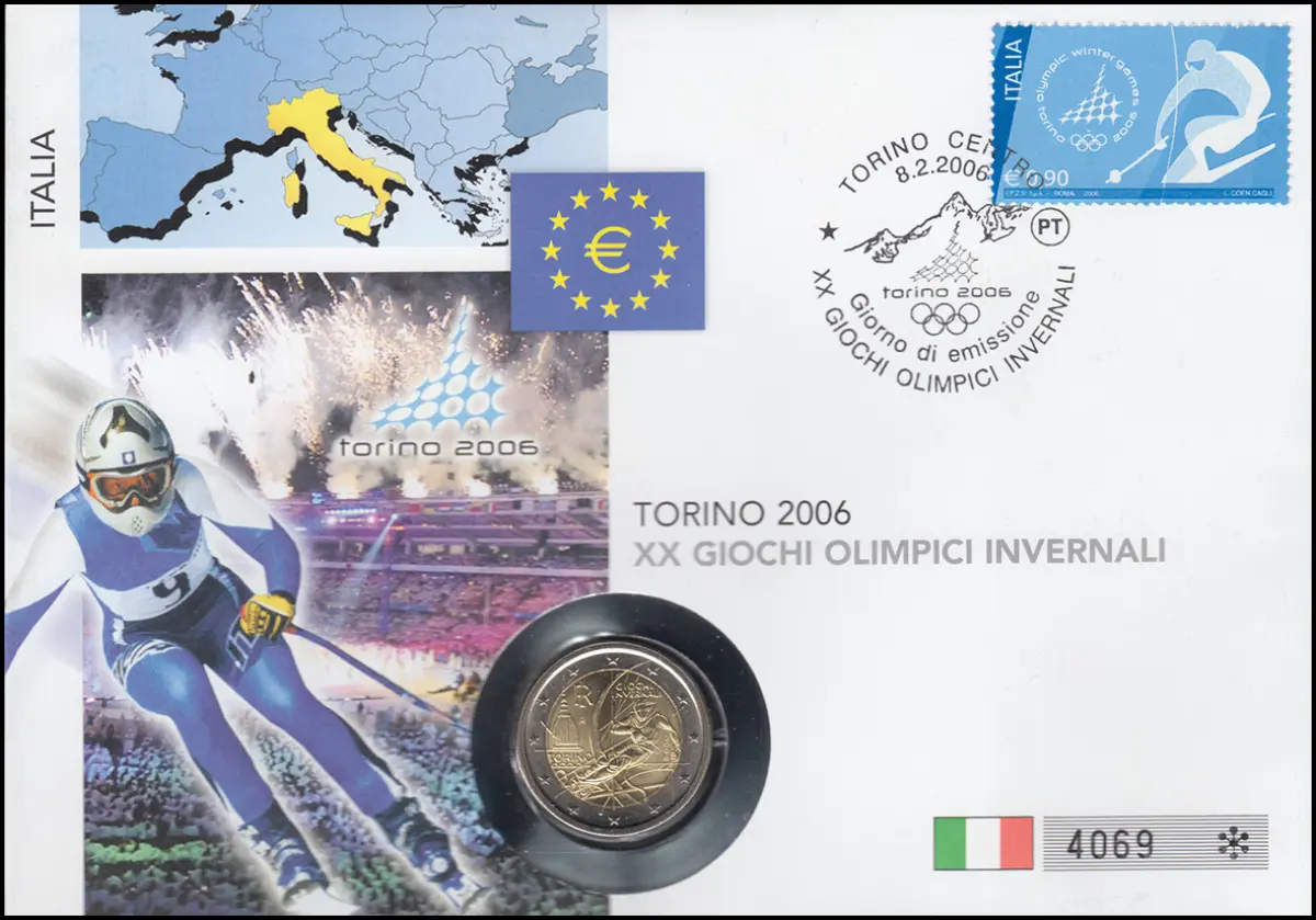 Numisbrief Torino 2006 Italien, Münze 2 Euro SST 2006