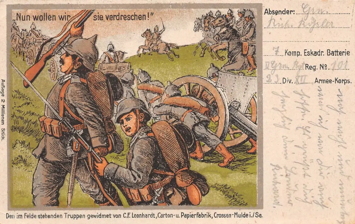 Nun wollen wir sie verdreschen! Soldaten im Felde Patriotika Postkarte AK 1915