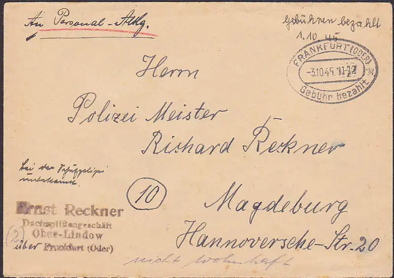 Ober-Lindow über Frankfurt (Oder) 3.10.45 hs "Gebühren bezahlt 1.10.45" in Litertatur unbekannt