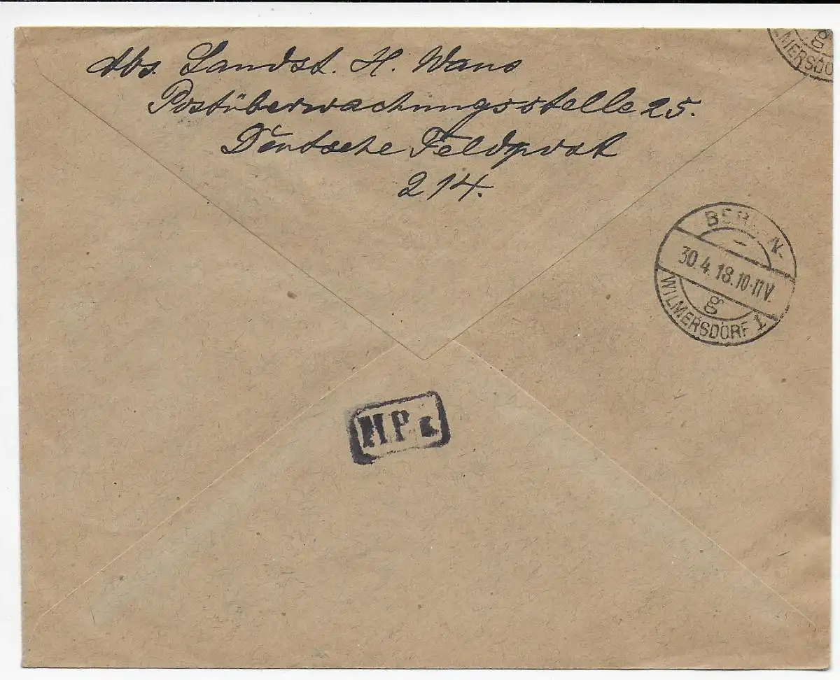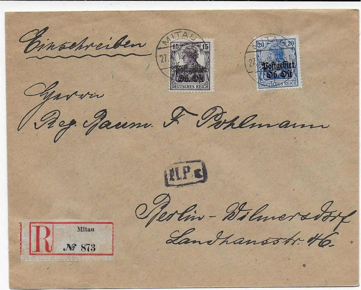 Ober Ost: Eiinschreiben Mitau nach Berlin, 1918: Feldpost Postüberwachungsstelle