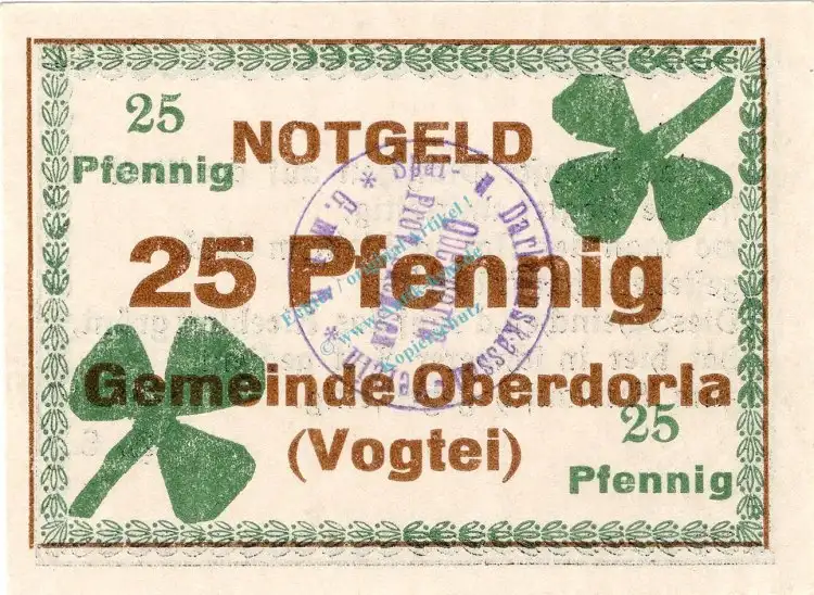 Oberdorla , Notgeld 25 Pfennig Schein in unc-kfr. Ti.5225.05.005 , Thüringen o.D. Verkehrsausgabe
