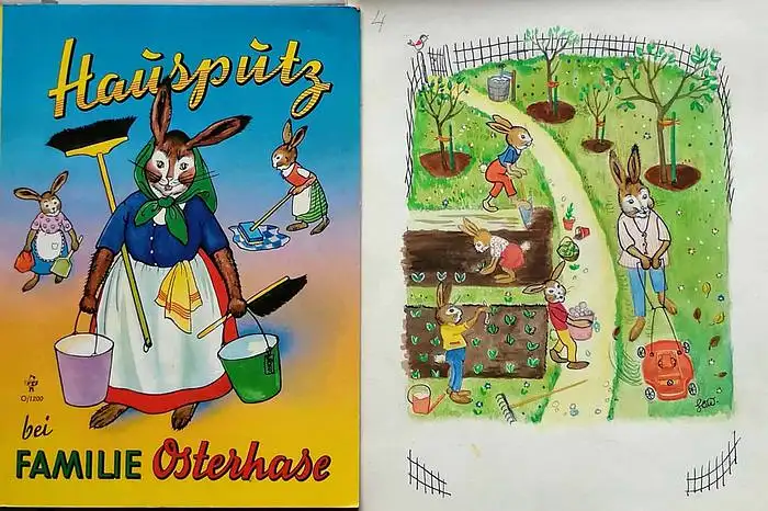 Obermaier-Wenz, Hedda: 1 farb. unsignierte Original-zeichnung zu "Hausputz bei Familie Osterhase". (Bilder von H. Obermaier-Wenz.).
