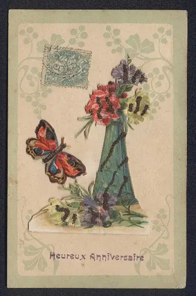 Oblaten-AK Nelken in einer Blumenvase mit aufgeklebtem Schmetterling