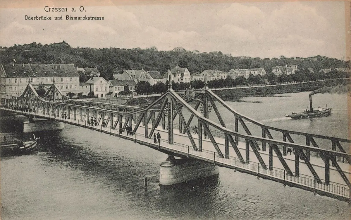 Oderbrücke und Bismarckstraße Crossen an der Oder Ostbrandenburg Postkarte AK