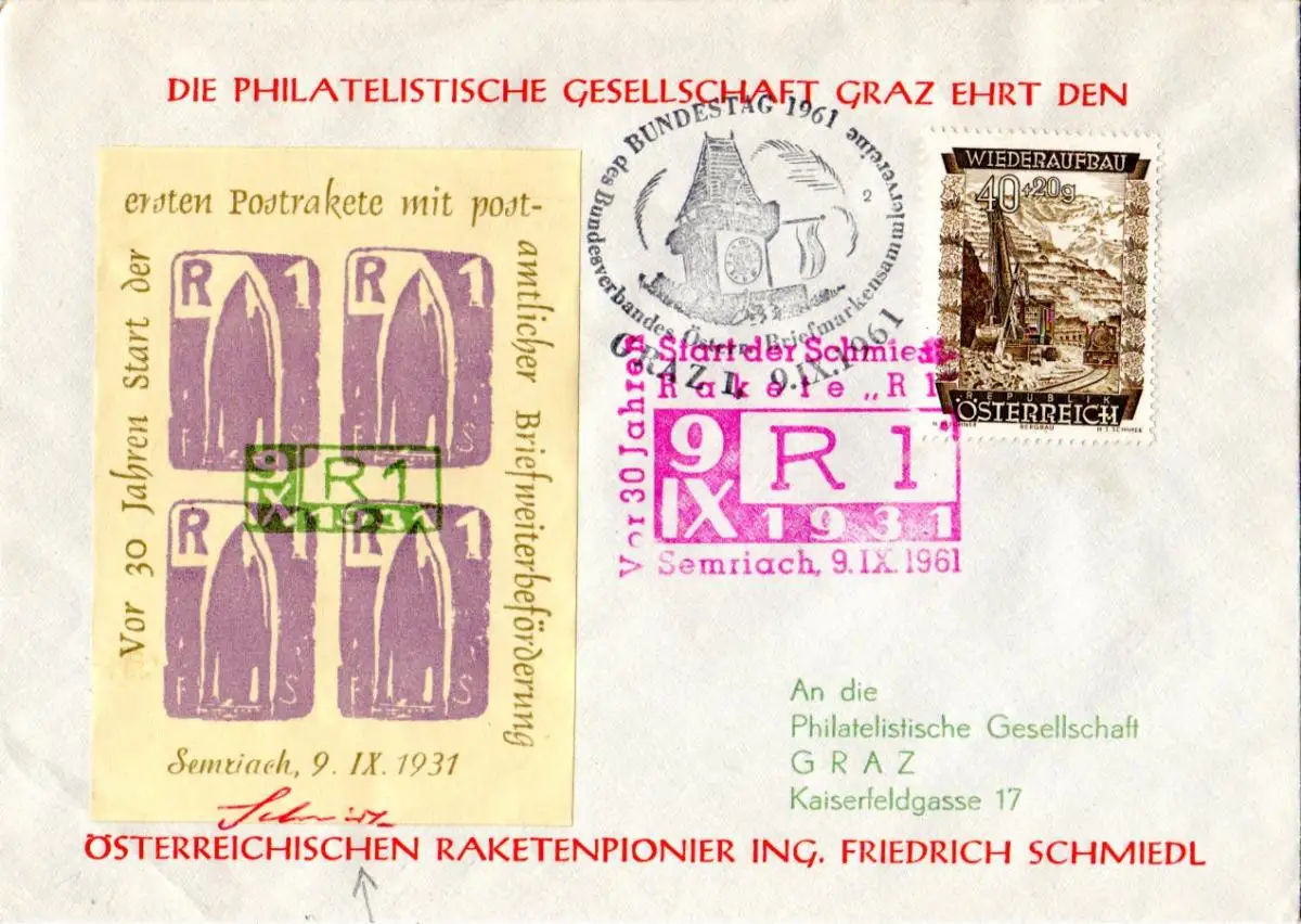 ÖSTERREICH RAKETENPOST 1961 Brief m. Raketenblock u. Schmiedl Unterschrift