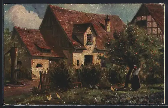 Ölgemälde-Imitations-AK Bäuerin pflückt Äpfel auf ihrem Hof