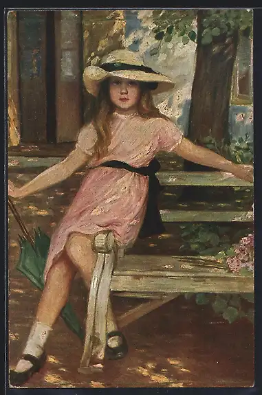 Ölgemälde-Imitations-AK Degi Nr. 533: Mädchen auf einer Bank unter dem alten Lindenbaum, von A. Kjellberg-Juel