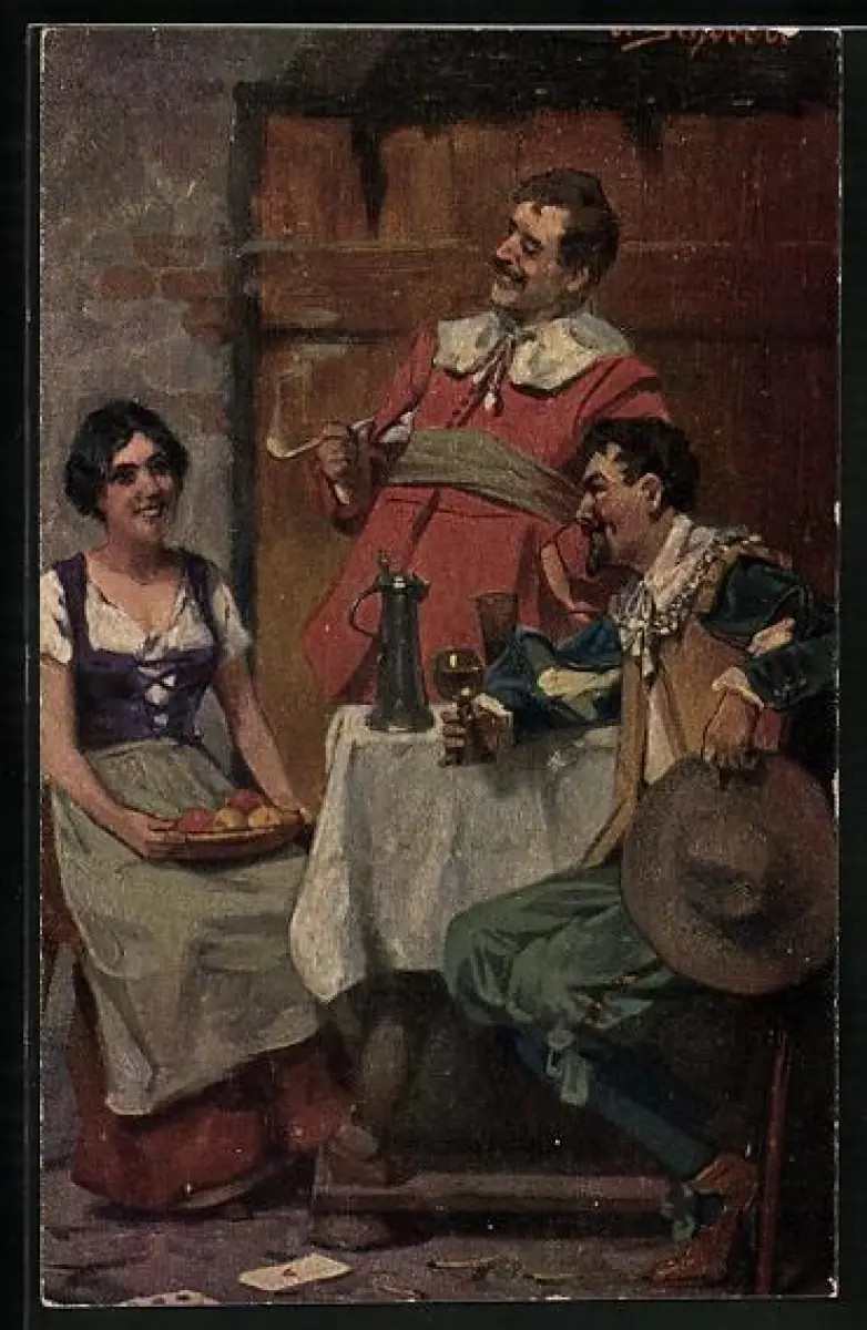 Ölgemälde-Imitations-AK Erpaco-Kunstverlag Nr. 22/1: Altdeutsche Trinker, Mädchen und zwei Trinker