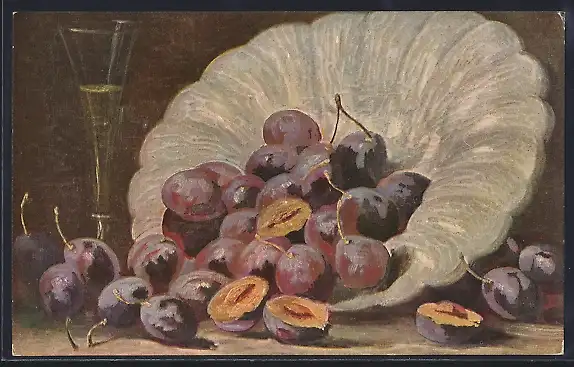 Ölgemälde-Imitations-AK Imita / A.S.-M. Leipzig Nr. 403: Stillleben, Pflaumen in einer Schale