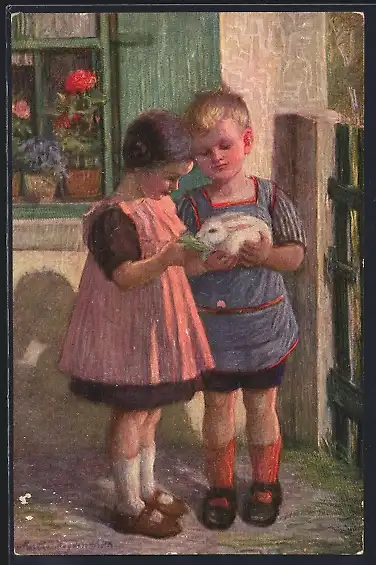 Ölgemälde-Imitations-AK Imita / A.S.-M. Leipzig Nr. 668: Kinderpaar mit einem Kaninchen
