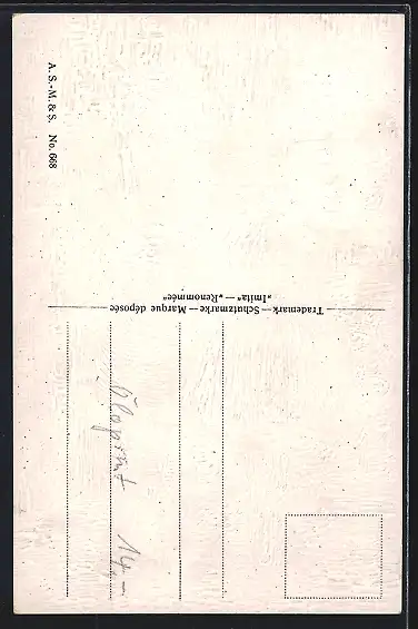 Personenbezogene Daten auf der Rückseite der Karte wurden durch blauen Textmarker unkenntlich gemacht. Die blauen Stellen sind auf die Vorderseite durchgeweicht und wirken sich negativ auf das Postkartenfoto aus