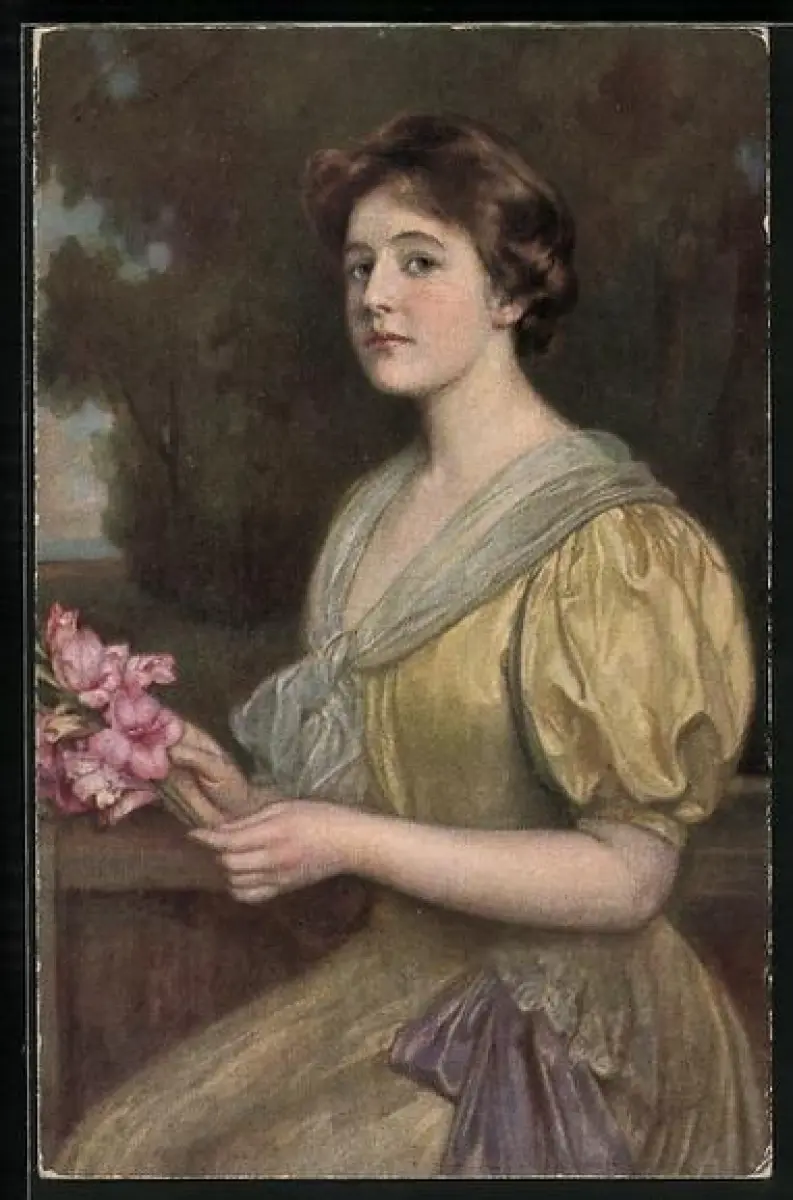 Ölgemälde-Imitations-AK In Gedanken, junge Dame mit Blumen