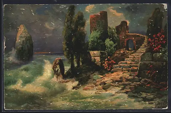 Ölgemälde-Imitations-AK Ruine über der Brandung