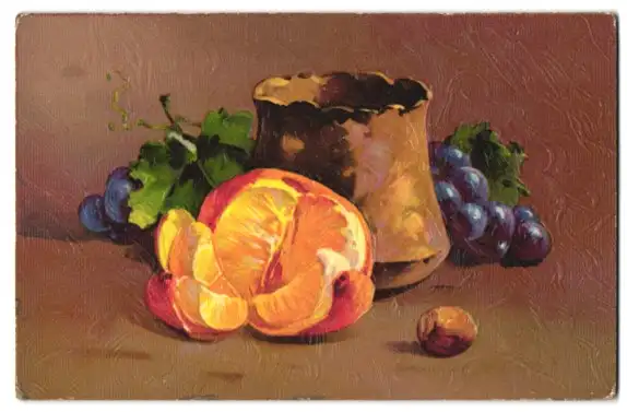 Ölgemälde-Imitations-AK Stilleben mit einer Orange und einem Tonkrug