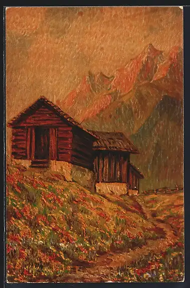 Ölgemälde-Imitations-AK Winand Elsmann-Verlag Nr. 1437: Gebirgseinsamkeit, Berghütte im Abendlicht