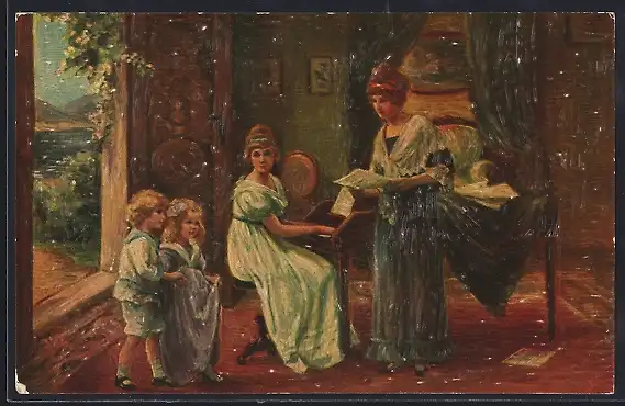 Ölgemälde-Imitations-AK Zwei Frauen musizieren mit ihren Kindern, Tanzstunde