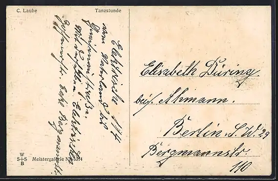 Personenbezogene Daten auf der Rückseite der Karte wurden durch blauen Textmarker unkenntlich gemacht. Die blauen Stellen sind auf die Vorderseite durchgeweicht und wirken sich negativ auf das Postkartenfoto aus