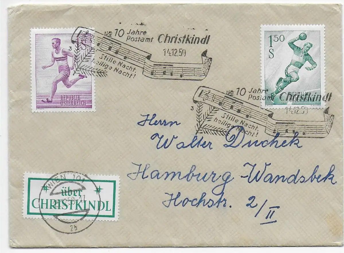 Österreich: 10 Jahre Postamt Christkindl, 1959 nach Hamburg