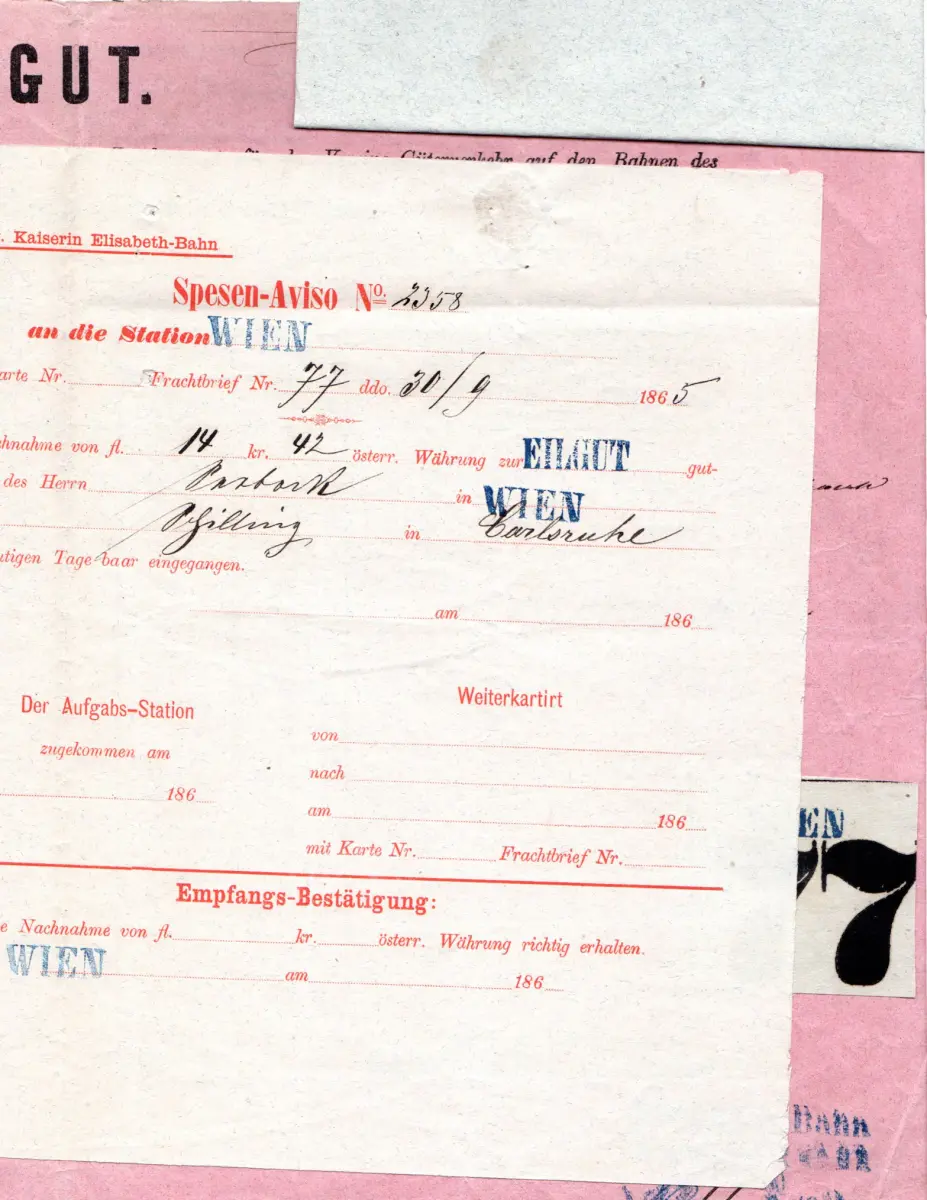 Eisenbahn Eilgut-Frachtbrief Begleitschein (mittig waagr. gefaltet) v. Wien via K.G.E. Salzburg mit 2 weiteren Anlagen, diversen Stempeln, Klebezetteln u. Vermerken.
