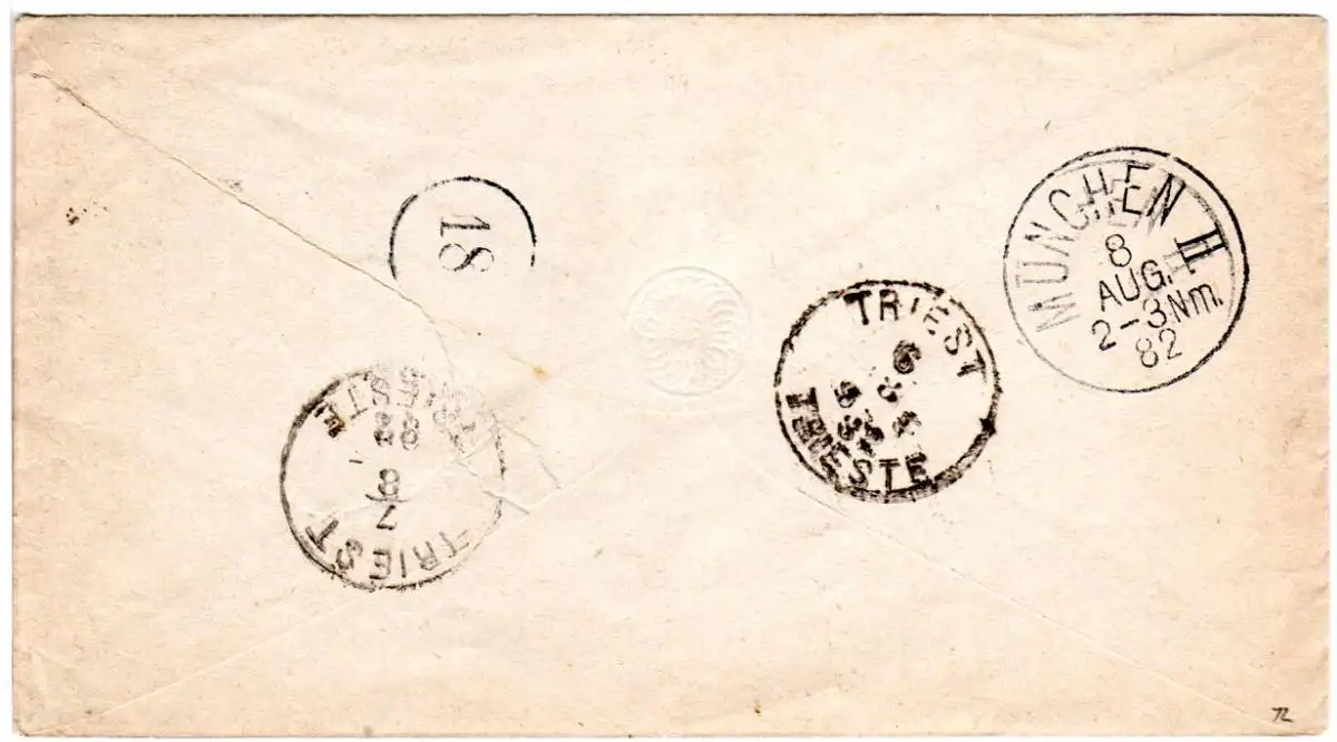 Ganzsachenumschlag nach Triest m. Adresse Hotel De Lorme, von dort Nachsendung n. München. Schöne rückseitige Stempeldokumentation.