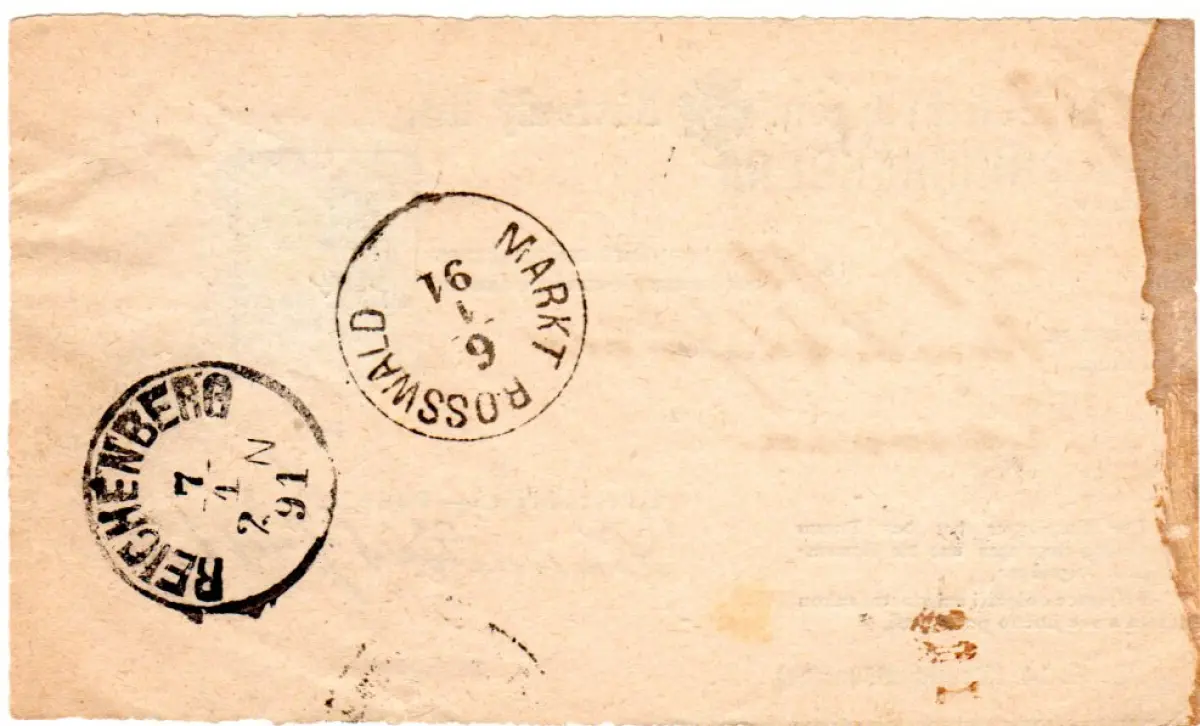 Retour Rezepisse m.2 weiteren rücks. Stempeln, u.a. K1 Markt Rosswald. Links Kleberspuren, dort war das Formular an der ursprünglichen Sendung angebracht.