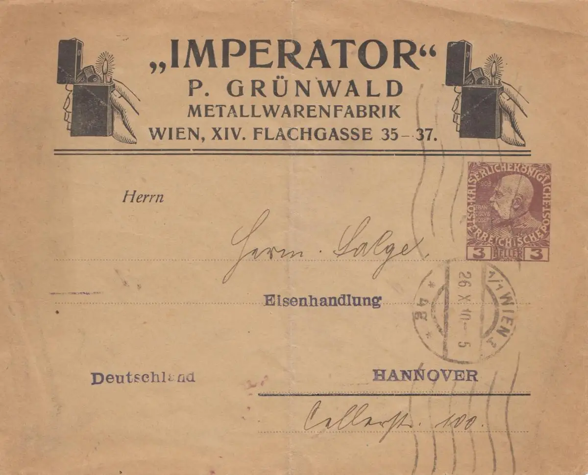 Österreich: 1910: Brief Imperator Metallwaren von Wien nach Hannover, Ganzsache