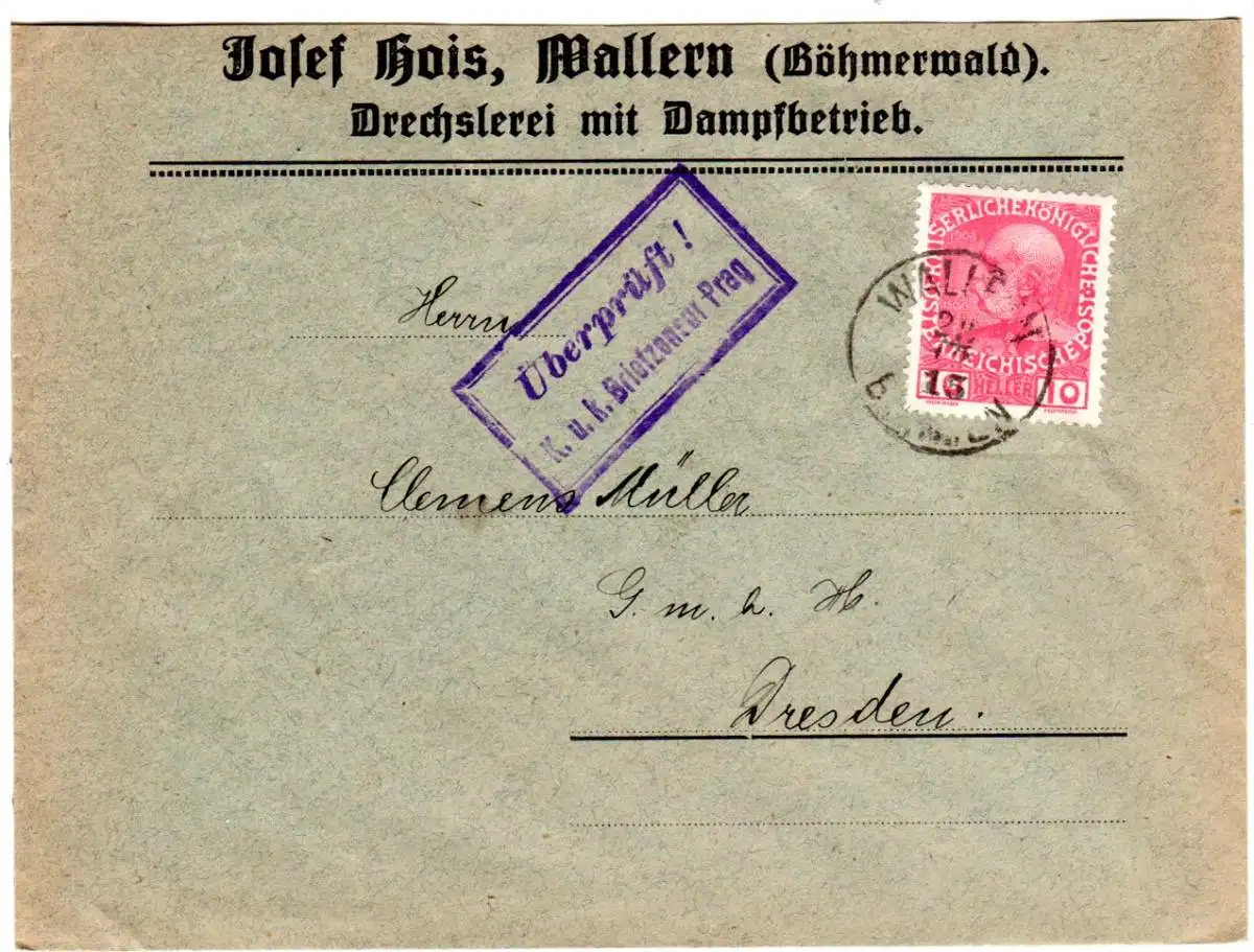 Österreich 1915, 10 H. auf Böhmen Firmenbrief v. Wallern m. Prag Zensur