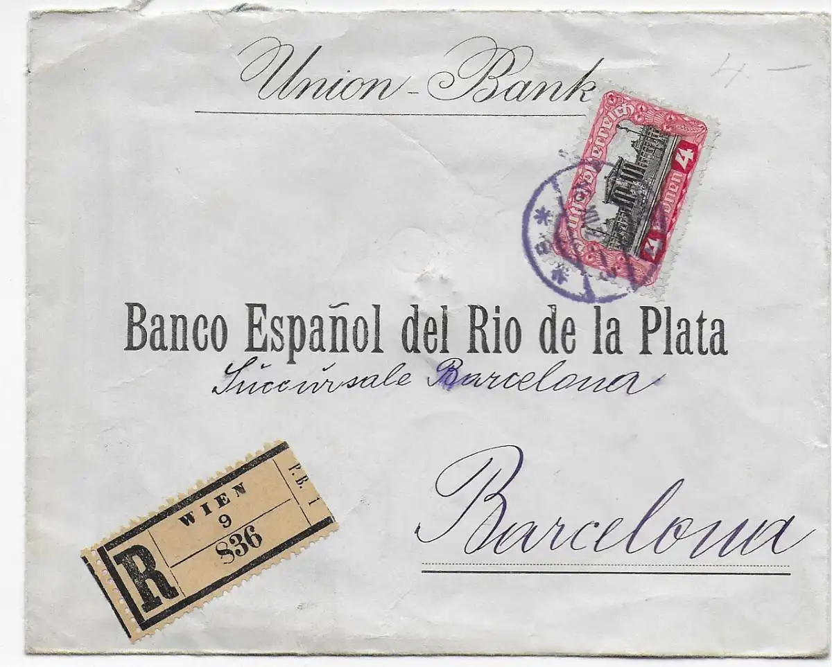Österreich 1920: Einschreiben Wien nach Barcelona, Bankbrief