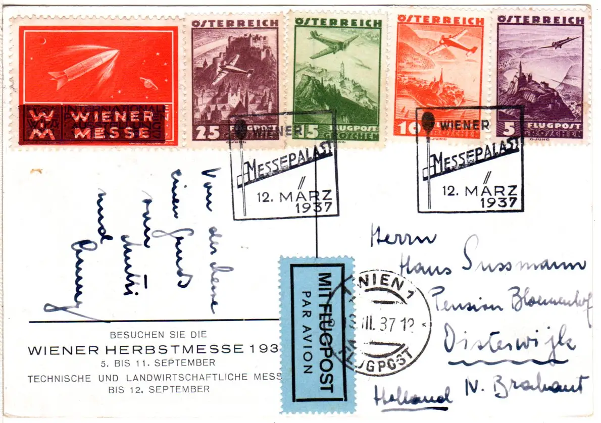 Österreich 1937, 4 Flugpostmarken u. Vignette auf Karte der Wiener Herbstmesse