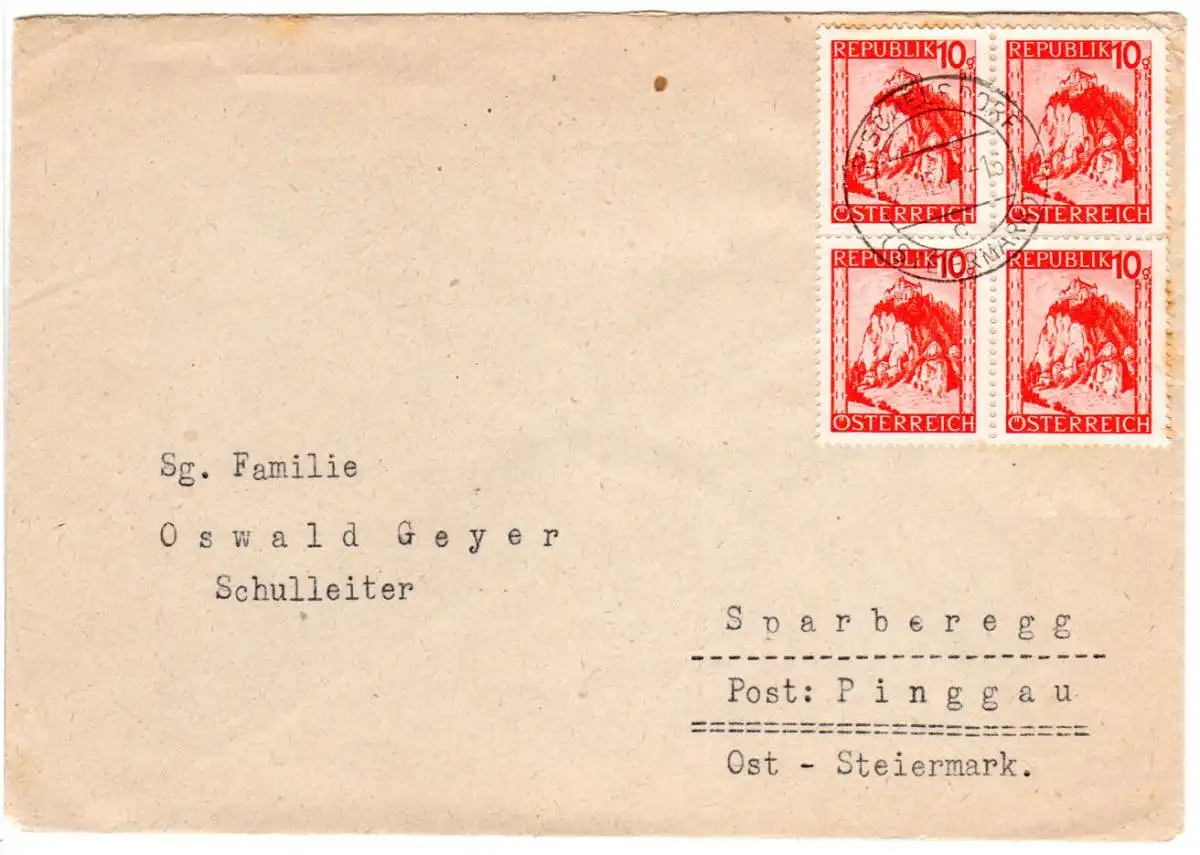 Österreich 1947, 4er-Block 10 G. auf Brief v. Pischelsdorf (Steiermark)