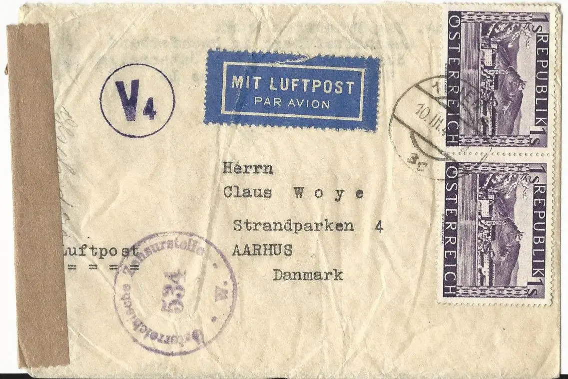 Österreich 1947, MeF Paar 1 S. auf Luftpost Zensur Brief v. Wien n. Dänemark.