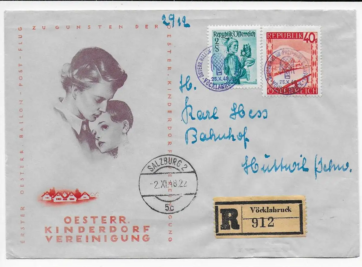 Österreich 1948 Einschreiben 1. Ballonpost Vöcklabruck nach Salzburg, Kinderdorf