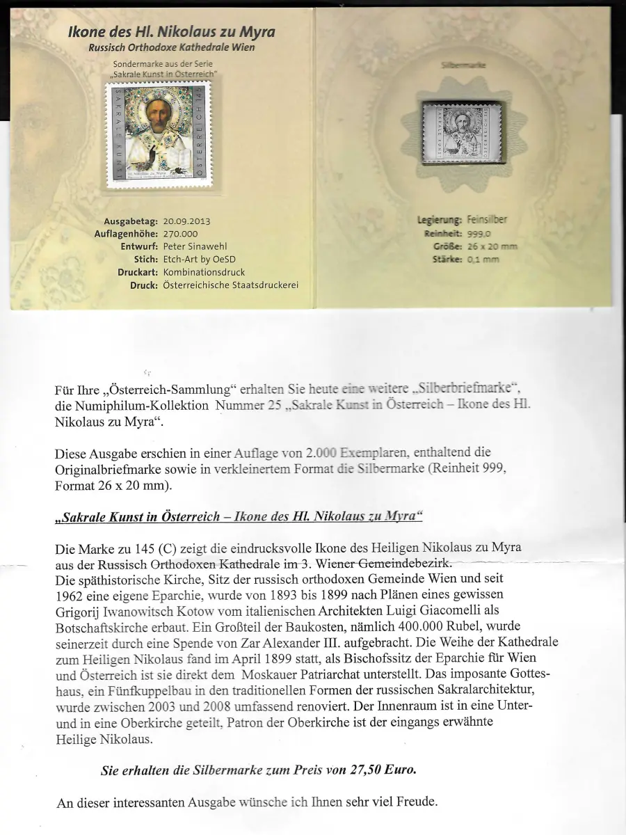 Österreich 2013: Silbermarke #25, Ikone des Hl. Nikolaus zu Myra, Feinsilber 999