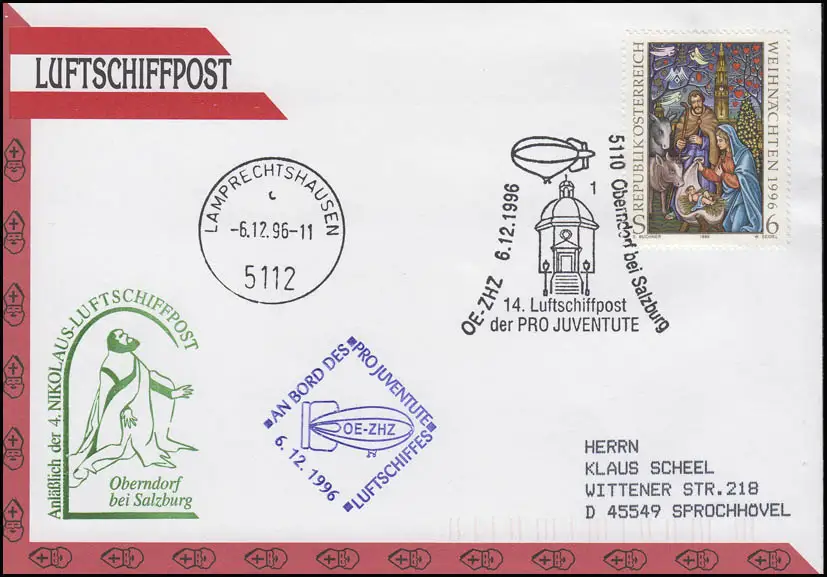 Österreich: 4. Ballonpost Nikolaus OE-ZHZ Pro Juventute Bf SSt Oberndorf 6.12.96