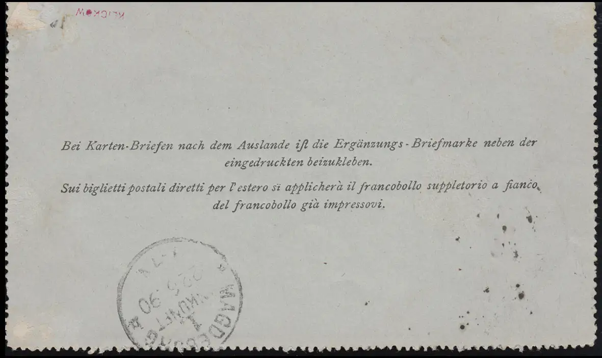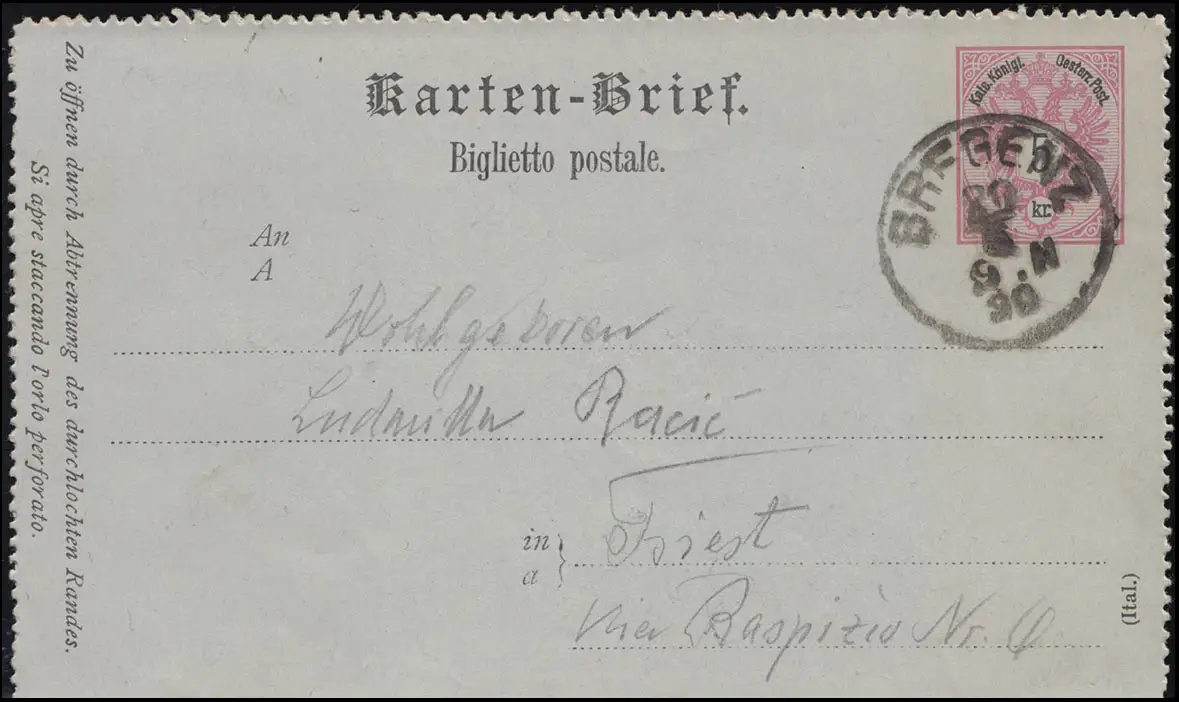 Österreich Kartenbrief K 10 BREGENZ 20.6.1890 nach Forst über MAGDEBURG 22.6.90