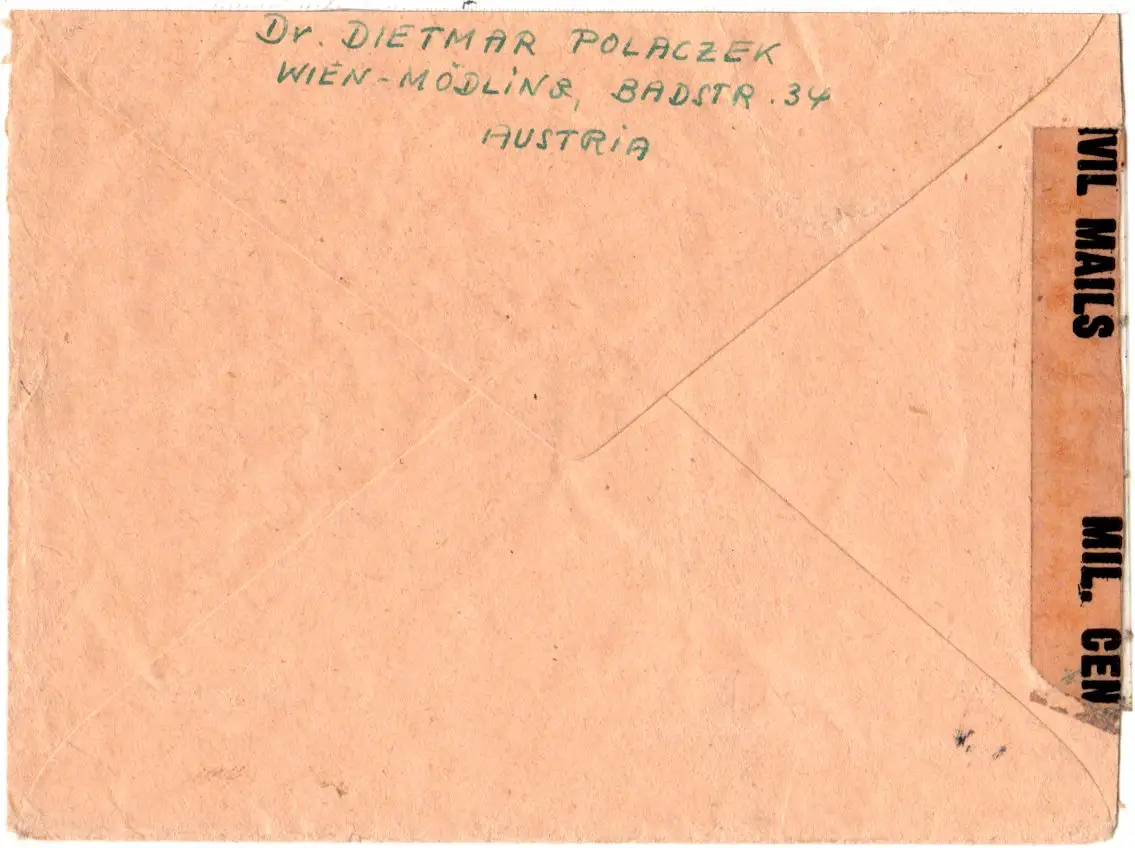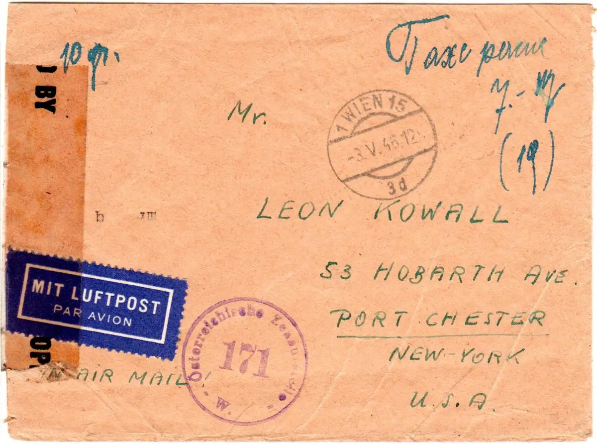 Österreich Mai 1946, früher Taxe percue Luftpost Brief v. Wien n. USA m. Zensur.