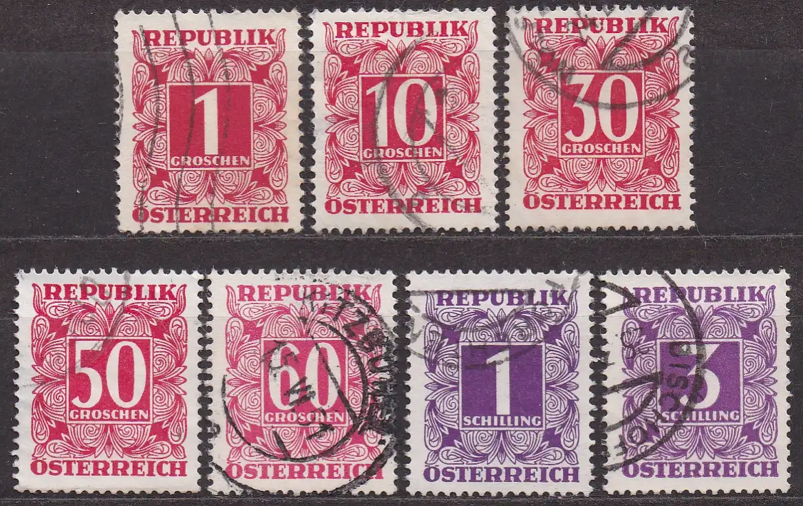 Österreich, Portomarken Mi-Nr. 232, 237, 239, 241, 242, 247 + 256 gest., Ziffernzeichnung im Zierrahmen