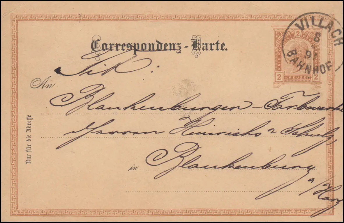 Österreich Postkarte P 74 Franz Joseph 2 Kr. VILLACH BAHNHOF 8.4.1891