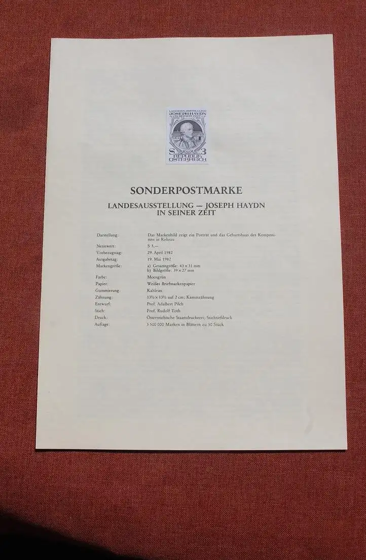 Österreich Schwarzdruck auf Schwarzdruckblatt 1982 zur Ausgabe: Joseph Haydn