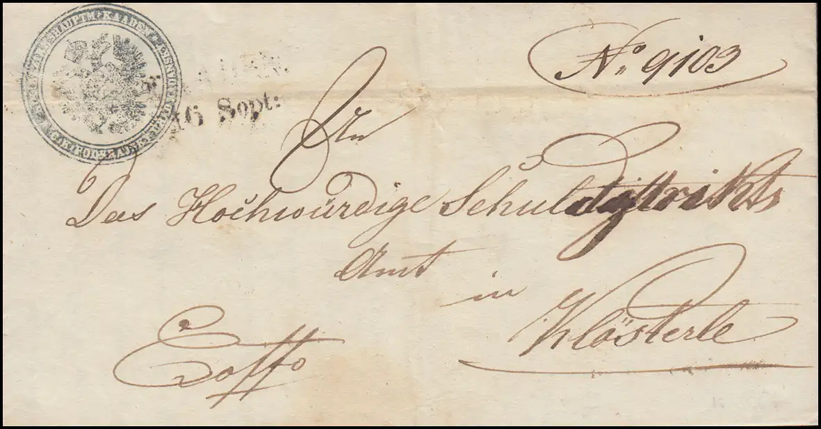 Amtsbrief mit Briefstempel BEZIRKSHAUPTMANN KAADEN an das Schuldgericht in Klösterle