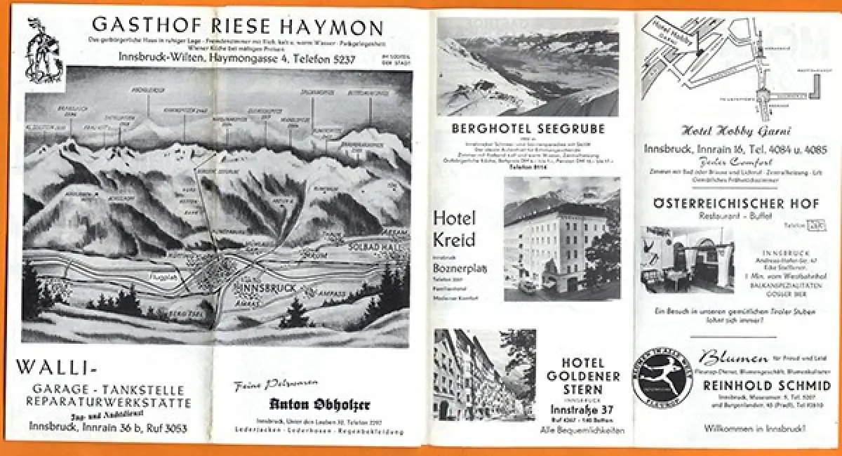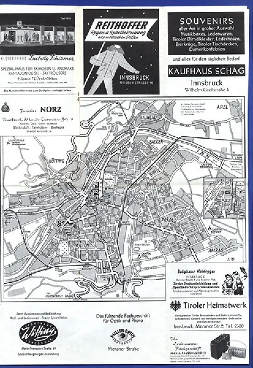 Österreich Wintersport Olympiade Olympiastadt Innsbruck Tourismus mehrseitiger Falt Werbeprospekt 1959/1960 für den Reise und Fremdenverkehr mit Straßenbahn Fahrplan