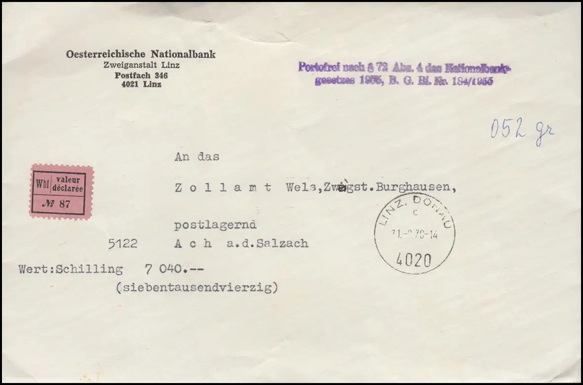 Österreichische Nationalbank Portofreier versiegelter Wertbrief LINZ 21.9.1978