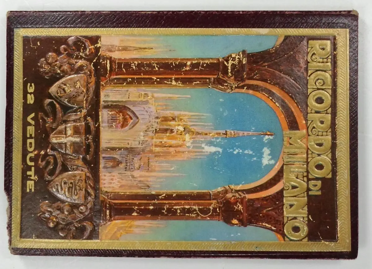 Leporello mit 32 Kartenteilen, davon 2 doppelseitige Ansichten (Dom und Domplatz); Bildlegenden am Bildrand sowie kurze Beschreibungen auf der Rückseite in italienischer, französischer, englischer und deutscher Sprache; Stadtplan mit Verzeichnis der wichtigsten 40 Sehenswürdigkeiten auf Innendeckeln. Ca. 16,7 x 11.5 cm, Kartoniert mit Prägung.
